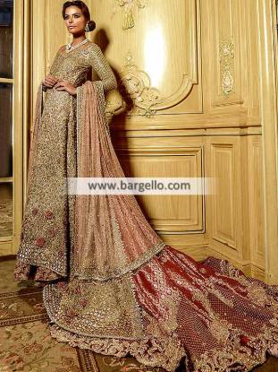 Embellished long shirt with embroidered blouse, embroidered lehenga, dupatta contains border on four sides, applique patches on middle. Pakistani Wedding Dresses Texas USA Faraz Manan Imperial Collection