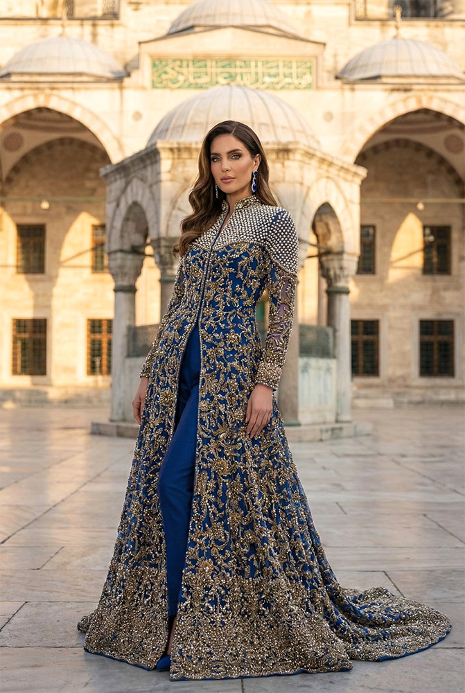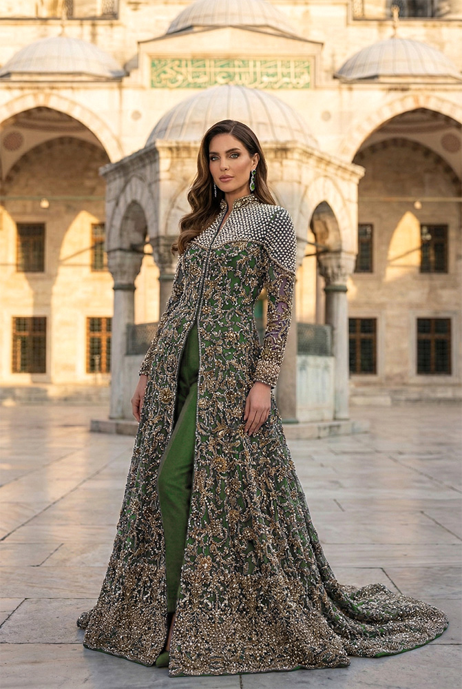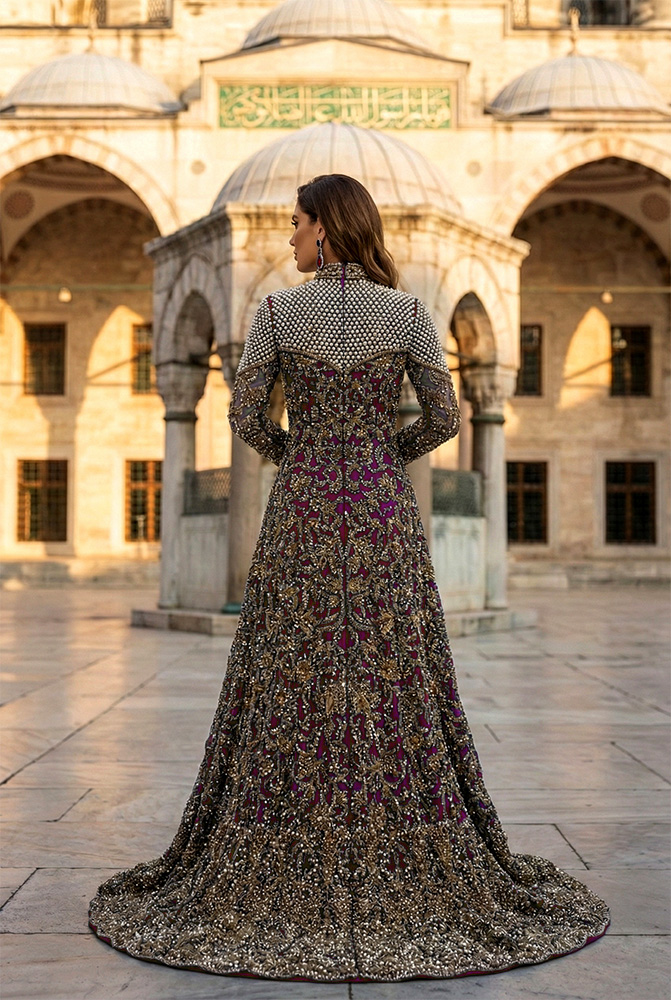 This Majestic Berry bridal gown is defined by structure and dense surface detail, built on a front-open net silhouette that reveals tailored raw silk pants beneath. The gown features full sheer sleeves and a high neck Bandh Gala collar, with a sculpted yoke described as a pearl armor that frames the chest and shoulders with controlled opulence. Geometric and floral motifs are worked together using dabka, kora, stones, sequins, and pearls, applied in a measured cascade that extends into a chapel-length trail finished with heavy borders. This balance of tradition and structure reflects designer Pakistani bridal gown craftsmanship and aligns with Pakistani bridal gown designs for wedding in USA sought by brides who value clarity of form. Its composed yet elaborate finish also appeals to those exploring Pakistani bridal gown shopping and searching for a bridal gown for Pakistani brides in USA that carries both heritage and precision.