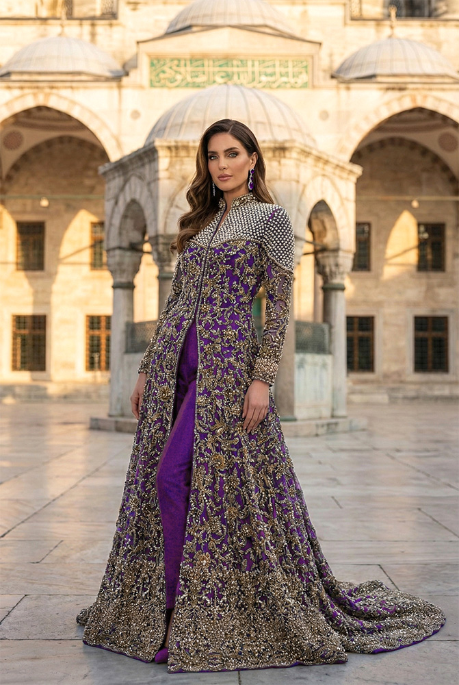 The open-front cut introduces movement and reveals the berry raw silk pants, giving the ensemble a distinct profile that sets it apart from conventional lehenga styles. An optional heavy bridal dupatta with a four-sided work border and fine sequin spray can be added to increase formality, allowing the look to adapt across wedding functions. Made-to-order and fully customizable, the design can also serve as a custom Indian bridal gown in UK or a wedding gown for Indian brides in UK who prefer a structured, regal silhouette. While offered in several hues, the richness of Berry offers an alternative to a red Pakistani bridal gown in Norway, maintaining bridal gravitas through craftsmanship rather than relying solely on traditional color.