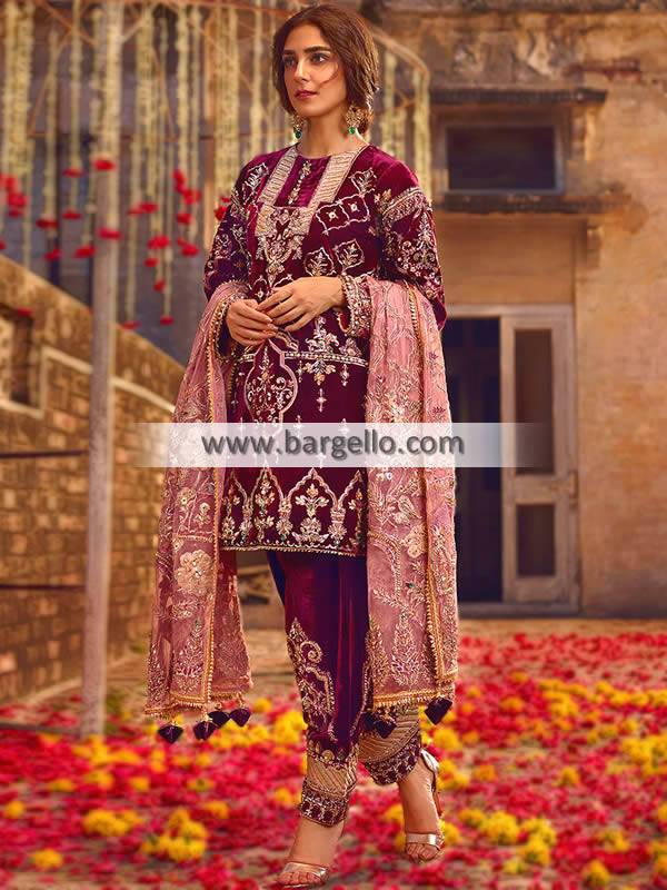 Burgundy Puce Kalmia Barat Dresses Wedding Event Dresses Virginia Maryland USA Mohsin Naveed Ranjha 1 review(s) Add your review Availability: In stock SKU: D7198 Delivery date: 4 - 6 Weeks Size * Size Chart | Custom Measurements Please select Select a Size Extra Small (XS) Small (S) Small 2 (S-2) Medium (M) Medium 2 (M-2) Large (L) [+$30.00] Large 2 (L-2) [+$30.00] Extra Large (XL) [+$30.00] Extra Large 2 (XL-2) [+$30.00] 2XL [+$30.00] 2XL-2 [+$30.00] Custom (Made to Measure) Sleeves * View Sleeve Designs Please select Select Sleeves As shown/described Angel Sleeves Bell Sleeves Bishop Sleeves Butterfly Sleeves [+$15.00] Cap Sleeves Churidar Sleeves Elbow Sleeves Flutter Sleeves Full Sleeves Half Sleeves Laces Sleeves Lantern Sleeves Maggan Sleeves Poet Sleeves Pointed Sleeves Puff Sleeves Raglan Sleeve Roll-up Sleeves Sleeveless Super Mini Tailored Sleeves Three Quarter Trumpet Sleeves Bottom * Please select Select Bottom As shown/described Palazzo Churidar Pajama Slim Pajama Baggy Shalwar Patiala Shalwar [+$30.00] Regular Shalwar Slim Shalwar Slim Trousers Bell Bottom Trousers Cropped Trousers Capri Pants Flappers Trousers Flared Trousers Straight Trousers Select your height * Please select Select your height 4 feet 5 in (135 cm) 4 feet 6 in (137 cm) 4 feet 7 in (139 cm) 4 feet 8 in (142 cm) 4 feet 9 in (144 cm) 4 feet 10 in (147 cm) 4 feet 11 in (149 cm) 5 feet (152 cm) 5 feet 1 in (154 cm) 5 feet 2 in (157 cm) 5 feet 3 in (160 cm) 5 feet 4 in (162.5 cm) 5 feet 5 in (165 cm) 5 feet 6 in (168 cm) 5 feet 7 in (170 cm) 5 feet 8 in (173 cm) 5 feet 9 in (175 cm) 5 feet 10 in (178 cm) 5 feet 11 in (180 cm) 6 feet (183 cm) 6 feet 1 in (185 cm) 6 feet 2 in (188 cm) 6 feet 3 in (190.5 cm) 6 feet 4 in (193 cm) 6 feet 5 in (195 cm) 6 feet 6 in (198 cm) 6 feet 7 in (200 cm) 6 feet 8 in (203 cm) 6 feet 9 in (206 cm) 6 feet 10 in (208 cm) 6 feet 11 in (211 cm) 7 feet (213 cm) $899.95 Qty: Add to cart Ship to Select country United States Afghanistan Albania Algeria American Samoa Andorra Angola Anguilla Antarctica Antigua and Barbuda Argentina Armenia Aruba Australia Austria Azerbaijan Bahamas Bahrain Bangladesh Barbados Belarus Belgium Belize Benin Bermuda Bhutan Bolivia Bosnia and Herzegowina Botswana Bouvet Island Brazil British Indian Ocean Territory Brunei Darussalam Bulgaria Burkina Faso Burundi Cambodia Cameroon Canada Cape Verde Cayman Islands Central African Republic Chad Chile China Christmas Island Cocos (Keeling) Islands Colombia Comoros Congo Congo (Democratic Republic of the) Cook Islands Costa Rica Cote D'Ivoire Croatia Cuba Cyprus Czech Republic Denmark Djibouti Dominica Dominican Republic East Timor Ecuador Egypt El Salvador Equatorial Guinea Eritrea Estonia Eswatini Ethiopia Falkland Islands (Malvinas) Faroe Islands Fiji Finland France French Guiana French Polynesia French Southern Territories Gabon Gambia Georgia Germany Ghana Gibraltar Greece Greenland Grenada Guadeloupe Guam Guatemala Guinea Guinea-bissau Guyana Haiti Heard and Mc Donald Islands Honduras Hong Kong Hungary Iceland India Indonesia Iran (Islamic Republic of) Iraq Ireland Italy Jamaica Japan Jordan Kazakhstan Kenya Kiribati Korea Korea, Democratic People's Republic of Kosovo Kuwait Kyrgyzstan Lao People's Democratic Republic Latvia Lebanon Lesotho Liberia Libyan Arab Jamahiriya Liechtenstein Lithuania Luxembourg Macau Macedonia Madagascar Malawi Malaysia Maldives Mali Malta Marshall Islands Martinique Mauritania Mauritius Mayotte Mexico Micronesia Moldova Monaco Mongolia Montenegro Montserrat Morocco Mozambique Myanmar Namibia Nauru Nepal Netherlands New Caledonia New Zealand Nicaragua Niger Nigeria Niue Norfolk Island Northern Mariana Islands Norway Oman Pakistan Palau Palestine Panama Papua New Guinea Paraguay Peru Philippines Pitcairn Poland Portugal Puerto Rico Qatar Reunion Romania Russian Federation Rwanda Saint Kitts and Nevis Saint Lucia Saint Vincent and the Grenadines Samoa San Marino Sao Tome and Principe Saudi Arabia Senegal Serbia Seychelles Sierra Leone Singapore Sint Maarten Slovakia (Slovak Republic) Slovenia Solomon Islands Somalia South Africa South Georgia & South Sandwich Islands South Sudan Spain Sri Lanka St. Helena St. Pierre and Miquelon Sudan Suriname Svalbard and Jan Mayen Islands Sweden Switzerland Syrian Arab Republic Taiwan Tajikistan Tanzania Thailand Togo Tokelau Tonga Trinidad and Tobago Tunisia Turkey Turkmenistan Turks and Caicos Islands Tuvalu Uganda Ukraine United Arab Emirates United Kingdom United States minor outlying islands Uruguay Uzbekistan Vanuatu Vatican City State (Holy See) Venezuela Viet Nam Virgin Islands (British) Virgin Islands (U.S.) Wallis and Futuna Islands Western Sahara Yemen Zambia Zimbabwe * Other * Shipping Method Name Estimated Delivery Price No shipping options Apply Custom wishlist OK Add to wishlist Add to compare list Email a friend This trendy favorite velvet suit is perfect for celebrations to come. Top: Color: Dark Burgundy Fabric: Velvet A line style top features alluring and dazzling embellishment accent the neckline, front, sleeves and hemline Full sleeves Jewel neckline Keyhole back neck having hidden hooks Lining inside Hem and sleeves are finished with gota lace Bottom: Color: Dark Burgundy Fabric: Velvet Comes with slim shalwar features large sized ornamental motif and applique work border on bottom Full elasticated waist belt Dupatta: Color: Puce Fabric: Net Dupatta contains flourishing embellishments accent all over Lace border crafted on four sides Edges are finished with gota lace Dangling embellished tassels on corners Embellishment work made with: Dabka, stones, sequins, pearls, beads, pearls, silk threads and swarovski crystals. 100% pure highest quality imported fabric. Product tags Barat Dresses Wedding Event Dresses Virginia Maryland USA - Mohsin Naveed Ranjha zeba ghat naari (1)