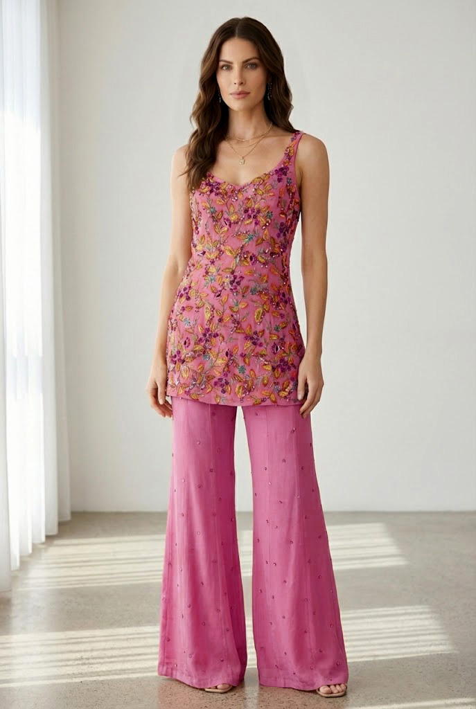 This Desert Peach chiffon ensemble is composed with restraint, relying on fine handwork and proportion rather than excess. The sleeveless chiffon shirt is fully lined with cotton silk for comfort and structure, and shaped with a leaf neckline that keeps the look formal and composed. Multi-hued hand embroidery is worked across the front, adding depth while remaining controlled, which places the design among heavily embroidered formal dresses without overwhelming the silhouette. Its balanced construction makes it suitable for Pakistani wedding guest dresses and Pakistani reception dresses, where elegance is expected to appear effortless rather than ornate.