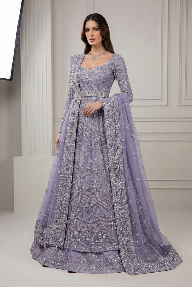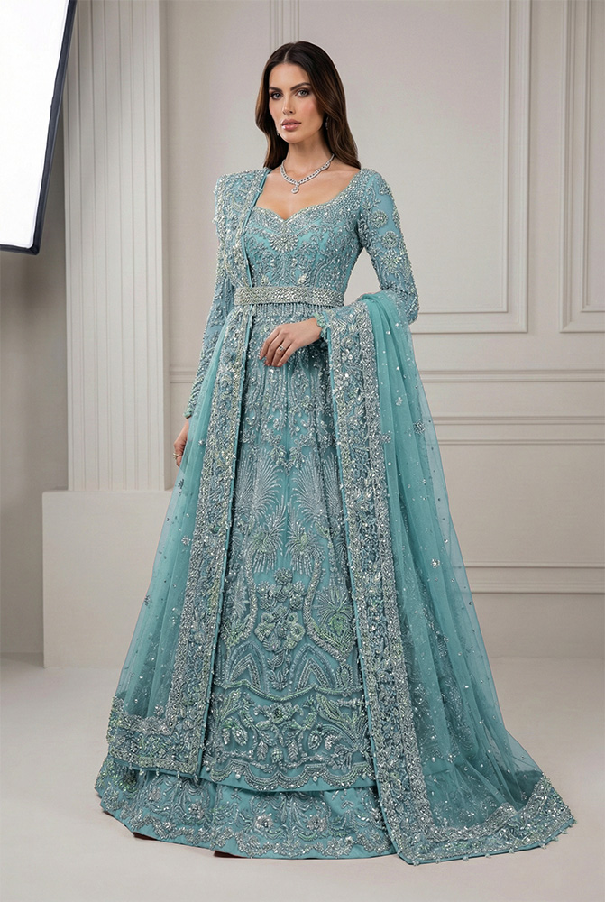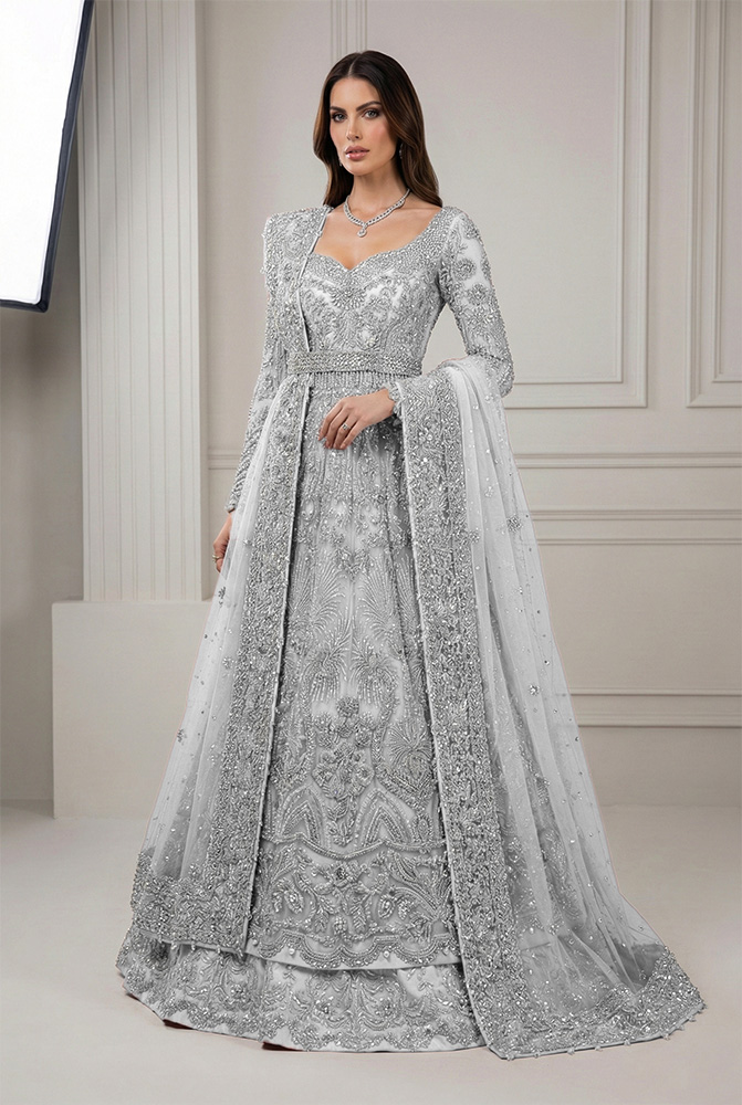 The matching Geraldine raw silk lehenga adds depth and support beneath the net layer, ensuring the ensemble maintains presence across different wedding settings. A delicate net dupatta completes the set, finished with a four-sided work border and a sparse scattering of small motifs with fine chann spray for cohesion. Together, the pieces allow the outfit to transition seamlessly as a Pakistani bridal gown for Nikah, a Pakistani bridal gown for Baraat ceremony, or a Pakistani bridal gown for Valima reception, depending on styling and jewelry. Made-to-order and fully customizable, the silhouette is offered in six curated hues, allowing brides to personalize the look while preserving its formal bridal character.