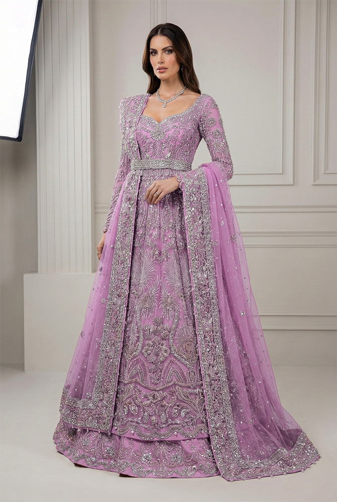 This Geraldine Pink bridal ensemble is built around a sculpted net gown layered over a structured raw silk lehenga, creating a clear and controlled bridal silhouette. The gown features full sheer sleeves, a sweetheart neckline and a hand embellished belt that defines the waist with precision. Swarovski crystals, traditional Gota, and dimensional 3D fabric florals are applied across the surface in a balanced arrangement, giving texture without visual clutter. This measured craftsmanship reflects the standards associated with Pakistani bridal gown designers and aligns with evolving Pakistani bridal gown trends that favor detail and structure over excess volume, making it a strong choice for Pakistani bridal gown online shopping through established Pakistani bridal gown boutiques.