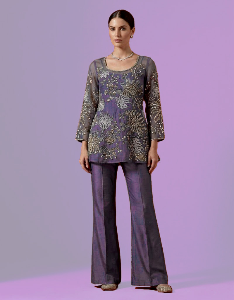 Heron organza short shirt with bootcut pants for sequin embroidered formal dresses, floral embroidered formal dresses, Indian and Pakistani wedding guest formal dresses, silk formal dresses, formal dress for winter weddings, short formal dress with sleeves, formal dress with bootcut pants.