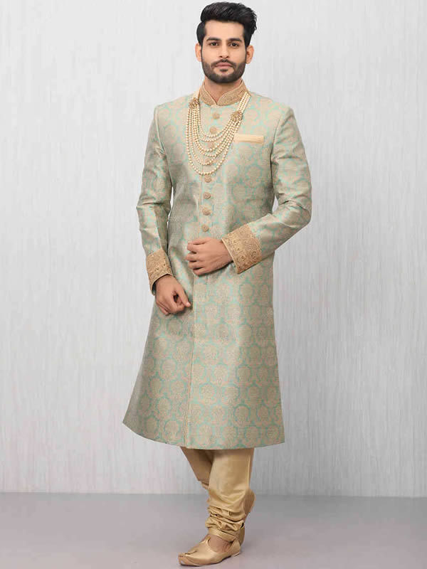 Gorgeous Jamawar Mens Sherwani M1759 Sherwani features rich quality embellishments accent the collar, sleeves, front and all over. Gorgeous Jamawar Mens Sherwani Pakistani Menswear UK USA Canada Australia $599.95 Add to cart Add to compare list Custom wishlist OK Add to wishlist