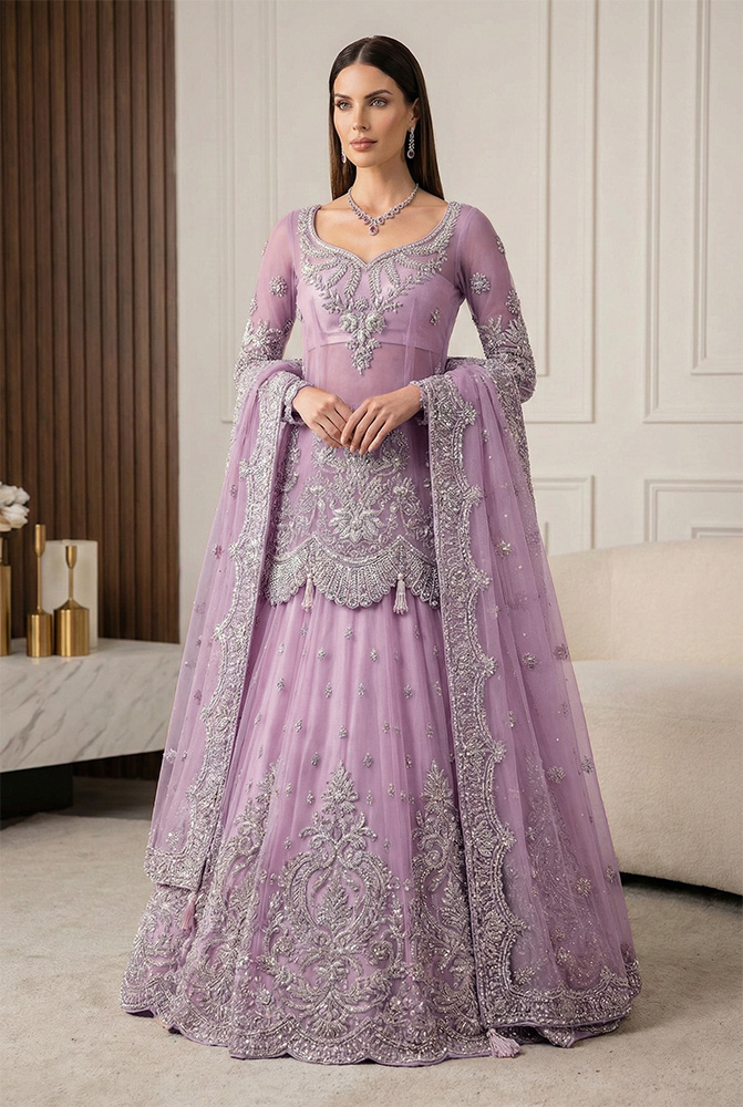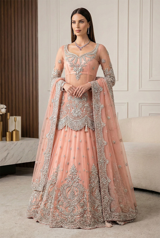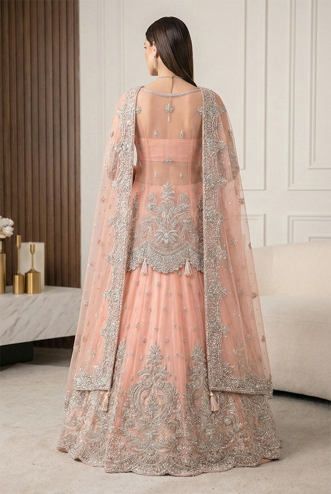 The matching Melon Pink net lehenga is finished with a scalloped hem that adds definition and balance, reinforcing its identity as a Pakistani bridal lehenga rather than a layered gown. A gossamer net dupatta completes the ensemble, detailed with a four-sided work border, corner tassels, small motifs, and a fine chann spray that keeps the surface active but restrained. Together, the pieces create a cohesive look suitable among Pakistani bridal outfits, offering the presence of a Pakistani bridal gown while retaining lehenga structure. Made-to-order and fully customizable, this design sits confidently among Pakistani designer bridal dresses and remains a considered option for bridal dresses for Pakistani brides seeking clarity, craftsmanship, and personalization.