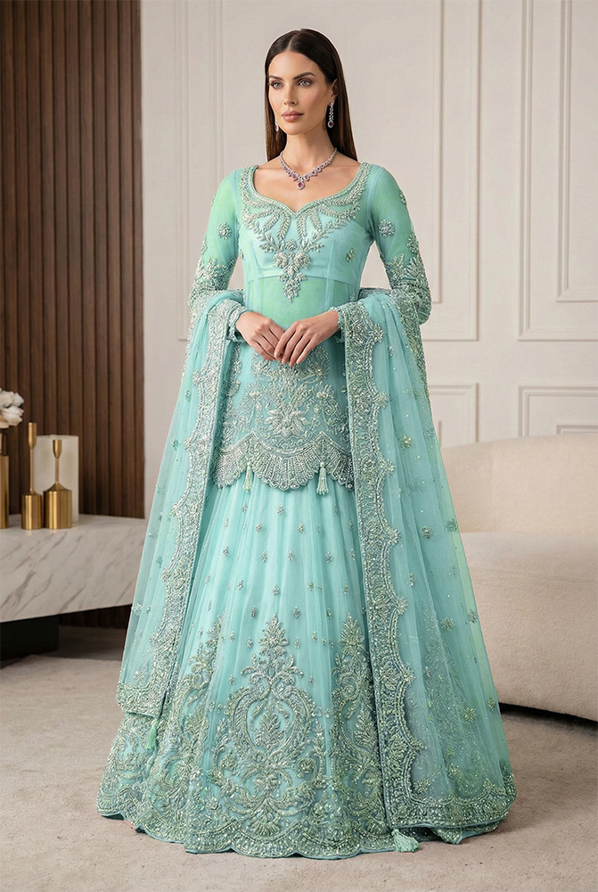 This Melon Pink bridal lehenga is constructed to emphasize form and surface detail through a controlled, figure-hugging silhouette. The net shirt features full sheer sleeves, an illusion neckline, and tassels at the hem, with a matching silk tube top included for coverage and structure. Swarovski crystals, traditional Gota work, and hand-cut fabric florals are applied with density but order, placing the design clearly within Pakistani bridal dresses and refined Pakistani bridal wear. The measured use of embellishment and net fabric reflects the standards of Pakistani bridal couture, while the overall composition aligns with the expectations of traditional Pakistani bridal wear without relying on excess volume.