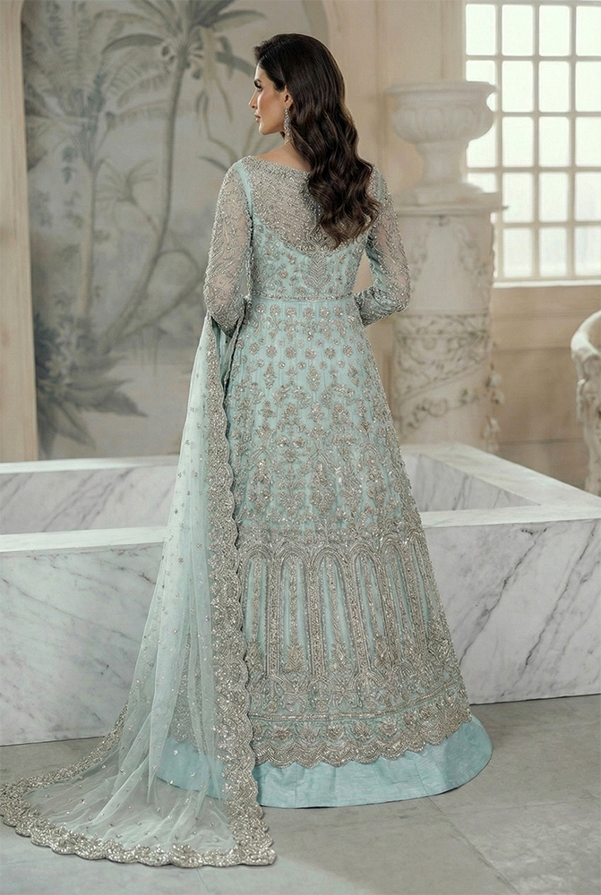 Oyster Bay Allen Bridal Gown Immerse yourself in the ethereal beauty of our Oyster Bay bridal gown. Bathed in a soft Light Cyan palette, this masterpiece features a marriage of French floral motifs and traditional Zardozi and Gota work, accented by shimmering rouge-silver threads. With its heavily embellished dupatta and structured raw silk inner, this design offers a sophisticated play on light and texture that is truly mesmerizing. Be the first to review this product Availability: In stock SKU: D8051 Vendor: Bargello.com Delivery date: 10 - 12 Weeks Size * Size Chart | Custom Measurements Please select Select a Size Extra Small (XS) Small (S) Small 2 (S-2) Medium (M) Medium 2 (M-2) Large (L) [+$30.00] Large 2 (L-2) [+$30.00] Extra Large (XL) [+$30.00] Extra Large 2 (XL-2) [+$30.00] 2XL [+$30.00] 2XL-2 [+$30.00] Custom (Made to Measure) Sleeves * View Sleeve Designs Please select Select Sleeves As shown/described Angel Sleeves Bell Sleeves Bishop Sleeves Butterfly Sleeves [+$15.00] Cap Sleeves Churidar Sleeves Elbow Sleeves Flutter Sleeves Full Sleeves Half Sleeves Laces Sleeves Lantern Sleeves Maggan Sleeves Poet Sleeves Pointed Sleeves Puff Sleeves Raglan Sleeve Roll-up Sleeves Sleeveless Super Mini Tailored Sleeves Three Quarter Trumpet Sleeves Bottom * Please select Select Bottom As shown/described Palazzo Churidar Pajama Slim Pajama Baggy Shalwar Patiala Shalwar [+$30.00] Regular Shalwar Slim Shalwar Slim Trousers Bell Bottom Trousers Cropped Trousers Capri Pants Flappers Trousers Flared Trousers Straight Trousers Select your height * Please select Select your height 4 feet 5 in (135 cm) 4 feet 6 in (137 cm) 4 feet 7 in (139 cm) 4 feet 8 in (142 cm) 4 feet 9 in (144 cm) 4 feet 10 in (147 cm) 4 feet 11 in (149 cm) 5 feet (152 cm) 5 feet 1 in (154 cm) 5 feet 2 in (157 cm) 5 feet 3 in (160 cm) 5 feet 4 in (162.5 cm) 5 feet 5 in (165 cm) 5 feet 6 in (168 cm) 5 feet 7 in (170 cm) 5 feet 8 in (173 cm) 5 feet 9 in (175 cm) 5 feet 10 in (178 cm) 5 feet 11 in (180 cm) 6 feet (183 cm) 6 feet 1 in (185 cm) 6 feet 2 in (188 cm) 6 feet 3 in (190.5 cm) 6 feet 4 in (193 cm) 6 feet 5 in (195 cm) 6 feet 6 in (198 cm) 6 feet 7 in (200 cm) 6 feet 8 in (203 cm) 6 feet 9 in (206 cm) 6 feet 10 in (208 cm) 6 feet 11 in (211 cm) 7 feet (213 cm) $2,699.95 Qty: Add to cart Ship to Select country United States Afghanistan Albania Algeria American Samoa Andorra Angola Anguilla Antarctica Antigua and Barbuda Argentina Armenia Aruba Australia Austria Azerbaijan Bahamas Bahrain Bangladesh Barbados Belarus Belgium Belize Benin Bermuda Bhutan Bolivia Bosnia and Herzegowina Botswana Bouvet Island Brazil British Indian Ocean Territory Brunei Darussalam Bulgaria Burkina Faso Burundi Cambodia Cameroon Canada Cape Verde Cayman Islands Central African Republic Chad Chile China Christmas Island Cocos (Keeling) Islands Colombia Comoros Congo Congo (Democratic Republic of the) Cook Islands Costa Rica Cote D'Ivoire Croatia Cuba Cyprus Czech Republic Denmark Djibouti Dominica Dominican Republic East Timor Ecuador Egypt El Salvador Equatorial Guinea Eritrea Estonia Eswatini Ethiopia Falkland Islands (Malvinas) Faroe Islands Fiji Finland France French Guiana French Polynesia French Southern Territories Gabon Gambia Georgia Germany Ghana Gibraltar Greece Greenland Grenada Guadeloupe Guam Guatemala Guinea Guinea-bissau Guyana Haiti Heard and Mc Donald Islands Honduras Hong Kong Hungary Iceland India Indonesia Iran (Islamic Republic of) Iraq Ireland Italy Jamaica Japan Jordan Kazakhstan Kenya Kiribati Korea Korea, Democratic People's Republic of Kosovo Kuwait Kyrgyzstan Lao People's Democratic Republic Latvia Lebanon Lesotho Liberia Libyan Arab Jamahiriya Liechtenstein Lithuania Luxembourg Macau Macedonia Madagascar Malawi Malaysia Maldives Mali Malta Marshall Islands Martinique Mauritania Mauritius Mayotte Mexico Micronesia Moldova Monaco Mongolia Montenegro Montserrat Morocco Mozambique Myanmar Namibia Nauru Nepal Netherlands New Caledonia New Zealand Nicaragua Niger Nigeria Niue Norfolk Island Northern Mariana Islands Norway Oman Pakistan Palau Palestine Panama Papua New Guinea Paraguay Peru Philippines Pitcairn Poland Portugal Puerto Rico Qatar Reunion Romania Russian Federation Rwanda Saint Kitts and Nevis Saint Lucia Saint Vincent and the Grenadines Samoa San Marino Sao Tome and Principe Saudi Arabia Senegal Serbia Seychelles Sierra Leone Singapore Sint Maarten Slovakia (Slovak Republic) Slovenia Solomon Islands Somalia South Africa South Georgia & South Sandwich Islands South Sudan Spain Sri Lanka St. Helena St. Pierre and Miquelon Sudan Suriname Svalbard and Jan Mayen Islands Sweden Switzerland Syrian Arab Republic Taiwan Tajikistan Tanzania Thailand Togo Tokelau Tonga Trinidad and Tobago Tunisia Turkey Turkmenistan Turks and Caicos Islands Tuvalu Uganda Ukraine United Arab Emirates United Kingdom United States minor outlying islands Uruguay Uzbekistan Vanuatu Vatican City State (Holy See) Venezuela Viet Nam Virgin Islands (British) Virgin Islands (U.S.) Wallis and Futuna Islands Western Sahara Yemen Zambia Zimbabwe * Other * Shipping Method Name Estimated Delivery Price No shipping options Apply Custom wishlist OK Add to wishlist Add to compare list Email a friend Oyster Bay net gown with a raw silk inner dress, suited to designer Pakistani wedding gown, traditional Pakistani bridal gown, Pakistani bridal gown collection, latest Pakistani bridal gown designs, Pakistani bridal gown for walima, reception, and baraat.This Oyster Bay bridal gown is designed with a measured approach to detail and structure, using a light cyan palette to emphasize texture rather than weight. The net gown features full sleeves, a boat neckline, and a front slit opening that adds movement while keeping the silhouette formal. French floral motifs are combined with traditional Zardozi and Gota work, highlighted by rouge-silver threads that catch the light without excess shine. This balance of technique and restraint places the design firmly as a d