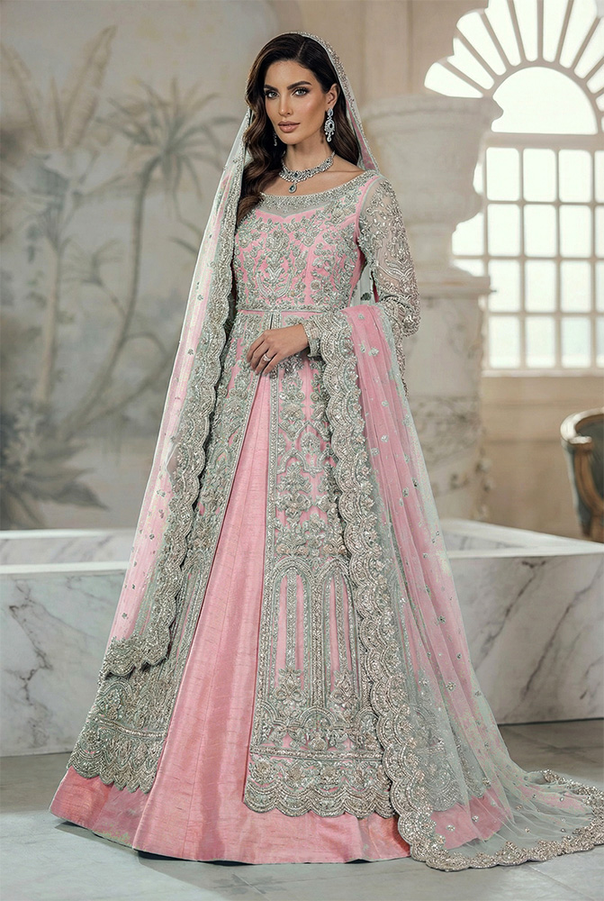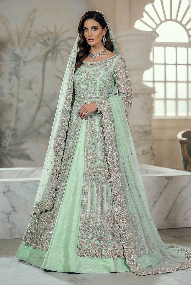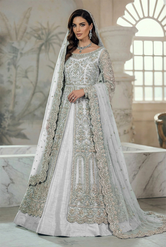 The gown is layered over a structured raw silk inner dress in matching Oyster Bay, giving the ensemble depth and support beneath the delicate net surface. A heavily embellished net dupatta, finished with a scalloped work border on all four sides and scattered ornamental motifs, completes the look with cohesion and intent. Made-to-order and fully customizable, this design adapts easily as a Pakistani bridal gown for walima, Pakistani bridal gown for reception, or Pakistani bridal gown for baraat, allowing the same silhouette to be styled across multiple wedding events while maintaining a consistent bridal identity.