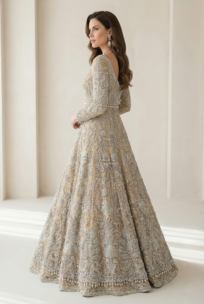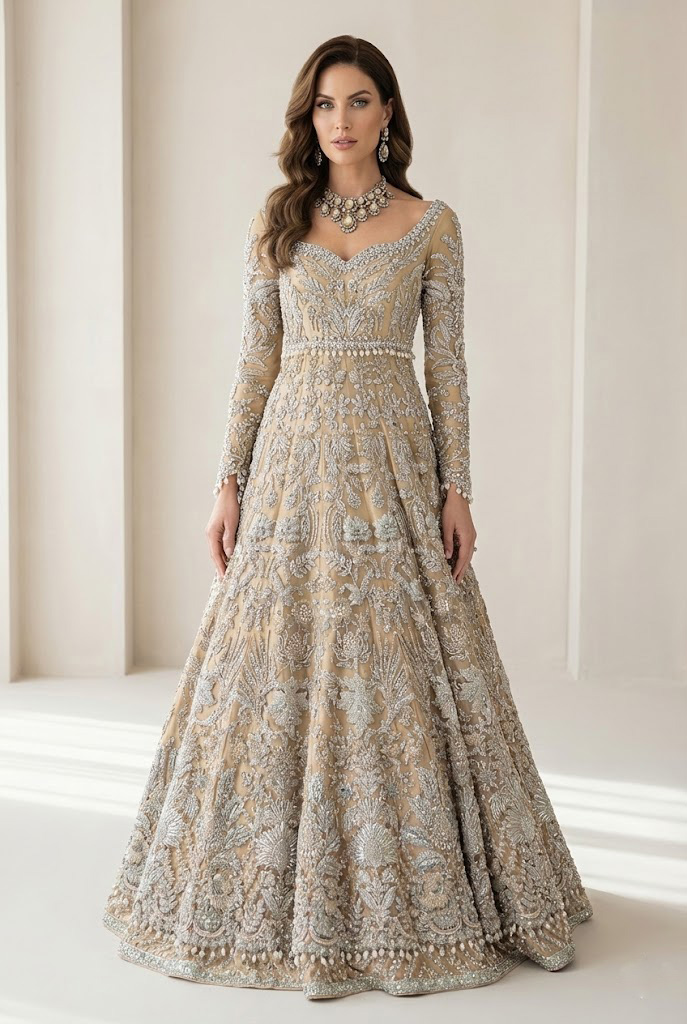 This peach champagne gown is constructed to balance delicacy with structure, using surface detail rather than excess volume to define its presence. Crafted in net with full sleeves and a sweetheart neckline, the gown features a careful fusion of French-inspired beading with traditional Zardozi and Gota embroidery, creating a layered and readable design. The restrained shimmer and controlled embroidery make it a bridal gown for Pakistani brides in USA and a wedding gown for Indian brides in UK who seek clarity of form with cultural detail. Its silhouette reflects Pakistani bridal gown designs for wedding in USA, where refinement and craftsmanship are prioritized over heaviness.
