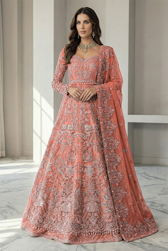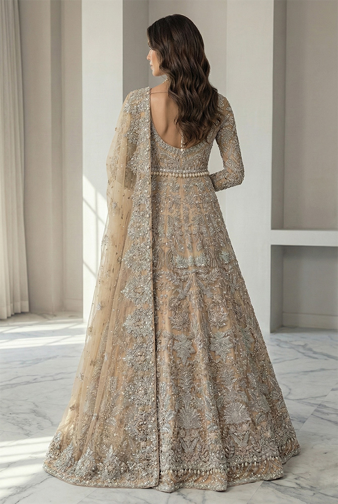 This Sandstone Beige gown is constructed to balance delicacy with structure, using surface detail rather than excess volume to define its presence. Crafted in net with full sleeves and a sweetheart neckline, the gown features a careful fusion of French-inspired beading with traditional Zardozi and Gota embroidery, creating a layered and readable design. The restrained shimmer and controlled embroidery make it a bridal gown for Pakistani brides in USA and a wedding gown for Indian brides in UK who seek clarity of form with cultural detail. Its silhouette reflects Pakistani bridal gown designs for wedding in USA, where refinement and craftsmanship are prioritized over heaviness.