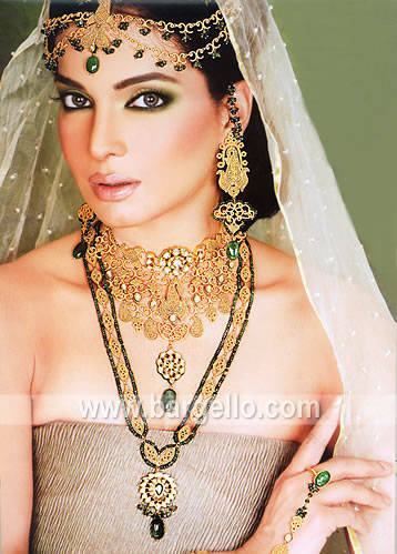 Style J374 Jewellery Designers in Pakistan Silver Jewelry Industry in Pakistan Be the first to review this product Availability: In stock SKU: J374 Delivery date: 4 - 6 Weeks $1,199.95 Qty: Add to cart Ship to Select country United States Afghanistan Albania Algeria American Samoa Andorra Angola Anguilla Antarctica Antigua and Barbuda Argentina Armenia Aruba Australia Austria Azerbaijan Bahamas Bahrain Bangladesh Barbados Belarus Belgium Belize Benin Bermuda Bhutan Bolivia Bosnia and Herzegowina Botswana Bouvet Island Brazil British Indian Ocean Territory Brunei Darussalam Bulgaria Burkina Faso Burundi Cambodia Cameroon Canada Cape Verde Cayman Islands Central African Republic Chad Chile China Christmas Island Cocos (Keeling) Islands Colombia Comoros Congo Congo (Democratic Republic of the) Cook Islands Costa Rica Cote D'Ivoire Croatia Cuba Cyprus Czech Republic Denmark Djibouti Dominica Dominican Republic East Timor Ecuador Egypt El Salvador Equatorial Guinea Eritrea Estonia Eswatini Ethiopia Falkland Islands (Malvinas) Faroe Islands Fiji Finland France French Guiana French Polynesia French Southern Territories Gabon Gambia Georgia Germany Ghana Gibraltar Greece Greenland Grenada Guadeloupe Guam Guatemala Guinea Guinea-bissau Guyana Haiti Heard and Mc Donald Islands Honduras Hong Kong Hungary Iceland India Indonesia Iran (Islamic Republic of) Iraq Ireland Italy Jamaica Japan Jordan Kazakhstan Kenya Kiribati Korea Korea, Democratic People's Republic of Kosovo Kuwait Kyrgyzstan Lao People's Democratic Republic Latvia Lebanon Lesotho Liberia Libyan Arab Jamahiriya Liechtenstein Lithuania Luxembourg Macau Macedonia Madagascar Malawi Malaysia Maldives Mali Malta Marshall Islands Martinique Mauritania Mauritius Mayotte Mexico Micronesia Moldova Monaco Mongolia Montenegro Montserrat Morocco Mozambique Myanmar Namibia Nauru Nepal Netherlands New Caledonia New Zealand Nicaragua Niger Nigeria Niue Norfolk Island Northern Mariana Islands Norway Oman Pakistan Palau Palestine Panama Papua New Guinea Paraguay Peru Philippines Pitcairn Poland Portugal Puerto Rico Qatar Reunion Romania Russian Federation Rwanda Saint Kitts and Nevis Saint Lucia Saint Vincent and the Grenadines Samoa San Marino Sao Tome and Principe Saudi Arabia Senegal Serbia Seychelles Sierra Leone Singapore Sint Maarten Slovakia (Slovak Republic) Slovenia Solomon Islands Somalia South Africa South Georgia & South Sandwich Islands South Sudan Spain Sri Lanka St. Helena St. Pierre and Miquelon Sudan Suriname Svalbard and Jan Mayen Islands Sweden Switzerland Syrian Arab Republic Taiwan Tajikistan Tanzania Thailand Togo Tokelau Tonga Trinidad and Tobago Tunisia Turkey Turkmenistan Turks and Caicos Islands Tuvalu Uganda Ukraine United Arab Emirates United Kingdom United States minor outlying islands Uruguay Uzbekistan Vanuatu Vatican City State (Holy See) Venezuela Viet Nam Virgin Islands (British) Virgin Islands (U.S.) Wallis and Futuna Islands Western Sahara Yemen Zambia Zimbabwe * Other * Shipping Method Name Estimated Delivery Price No shipping options Apply Custom wishlist OK Add to wishlist Add to compare list Email a friend Traditional set consists of a necklace, Rani haar (long necklace), pair of earrings, maatha patti (jewellery piece going across the head) and a hath panja with 1 ring attached (Wrist to finger piece). Emerald green stones. Delicate design. Kundan pendants. 925 Sterling Silver 24kt Gold plated Semi precious stones Setting work in silver Fully handmade Additional accessories available Available in required colours Made in Pakistan.