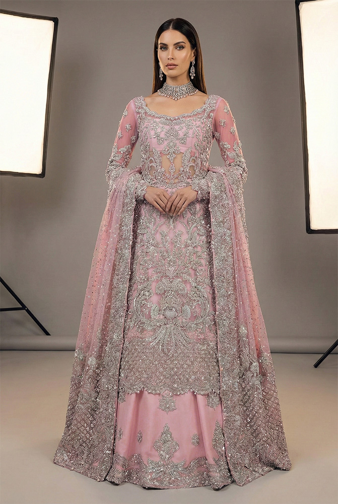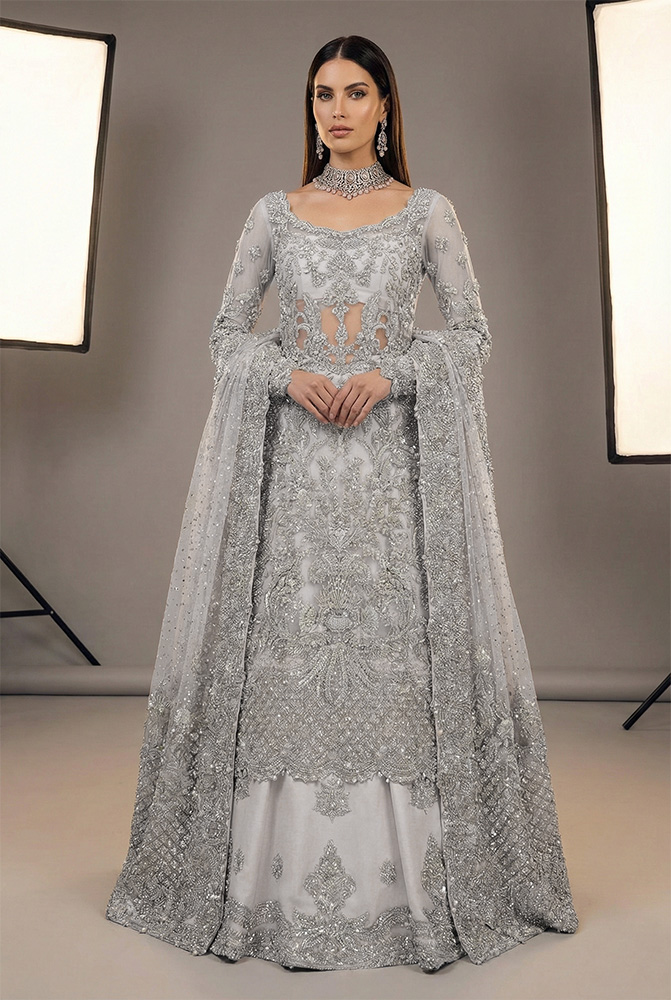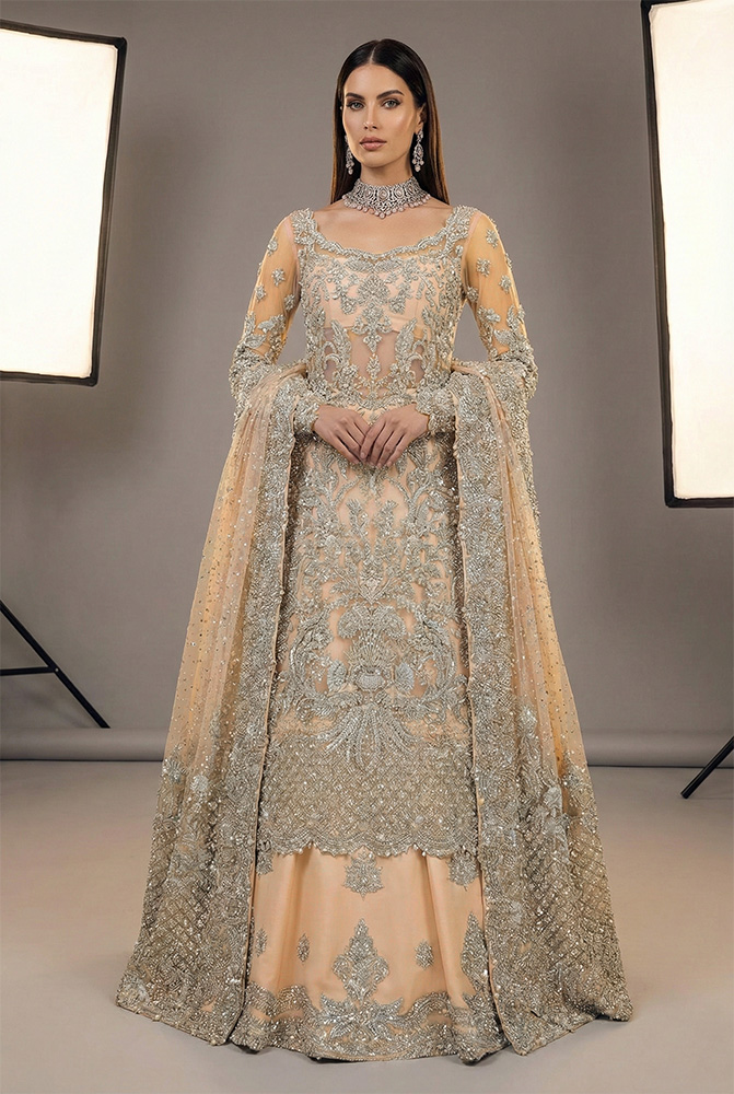 This Tea Green net bridal ensemble is composed with careful attention to balance, surface detail, and tradition, making it well suited for Pakistani nikah dresses and refined nikah bridal wear. The long net shirt is tailored with full sheer sleeves, a round neckline, and a scalloped hem, and is worn with a matching silk tube top for coverage and structure. Hand-sewn silvery floral motifs and intricate filigree work are applied densely yet evenly, giving the shirt clarity and depth without overwhelming the form. Its controlled silhouette and restrained embellishment make it an ideal nikah dress for bride and a thoughtful choice among dresses for nikah that value elegance over excess, reflecting the character of traditional nikah attire.