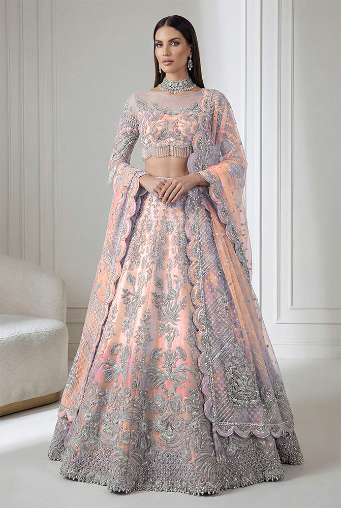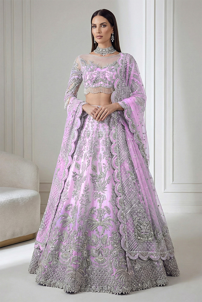 The raw silk lehenga continues the play of color through a subtle ombre effect, beginning in Titan White at the waist and gradually fading into a Ghost tone at the hem, where Ghost appears as a muted blend of gray and violet that deepens the overall palette. A matching net dupatta completes the ensemble, finished with a four-sided scalloped cutwork border, heavily embellished corner bunches, tassels, and a fine chann spray scattered across the body. Made-to-order and fully customizable, this design aligns with the level of craftsmanship expected at Pakistani bridal lehenga choli stores in Houston and Pakistani bridal lehenga choli stores in Chicago, where clarity of color, finish, and structure define bridal selections.