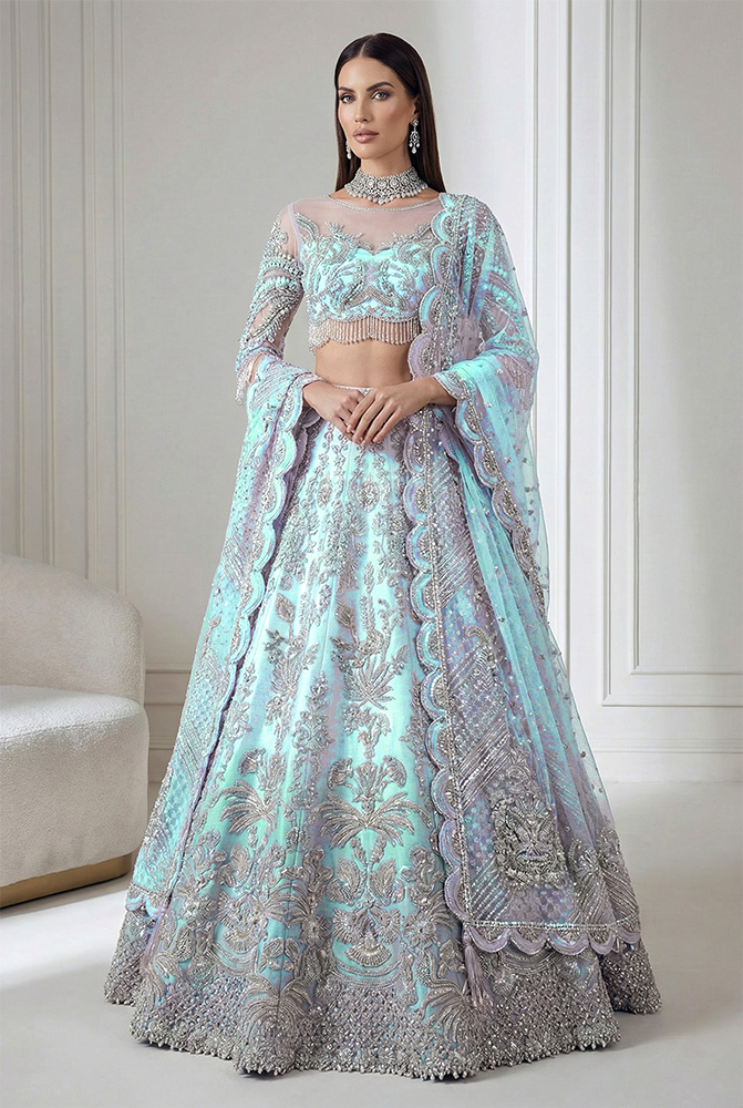 This Titan White bridal lehenga choli is constructed with attention to texture and controlled detail, using net and raw silk to create a formal and composed silhouette. Titan White is a luminous, pale shade that reads as soft white at first glance but reveals ethereal violet-blue undertones as light moves across the surface, giving the ensemble depth without heaviness. The net choli features full sheer sleeves, an illusion neckline, and delicate fringes at the hem that introduce movement in a restrained manner. Floral embellishments flow rhythmically across the fabric, interlaced with Zardozi, Gota, and stone work, giving the presence expected from a Pakistani bridal lehenga choli with heavy embellishments for nikkah ceremony. The design works naturally as Nikah ceremony attire and carries the refined influence of a Pakistani bridal lehenga choli inspired by bollywood without appearing overstated.